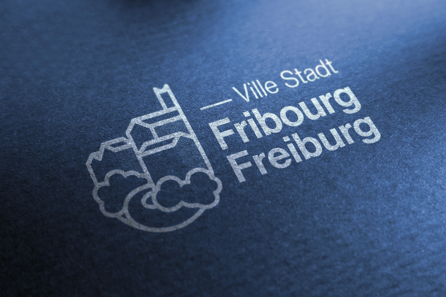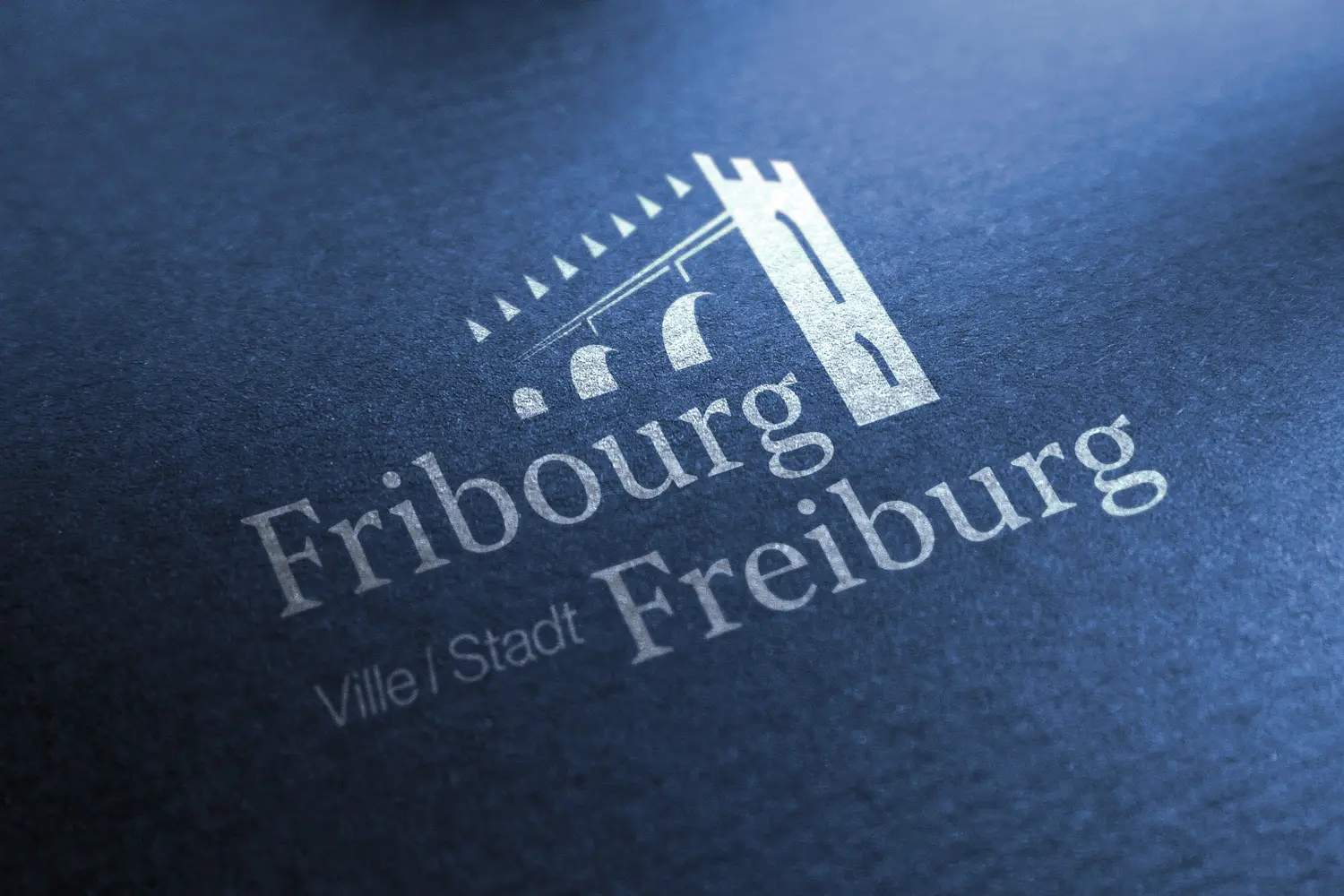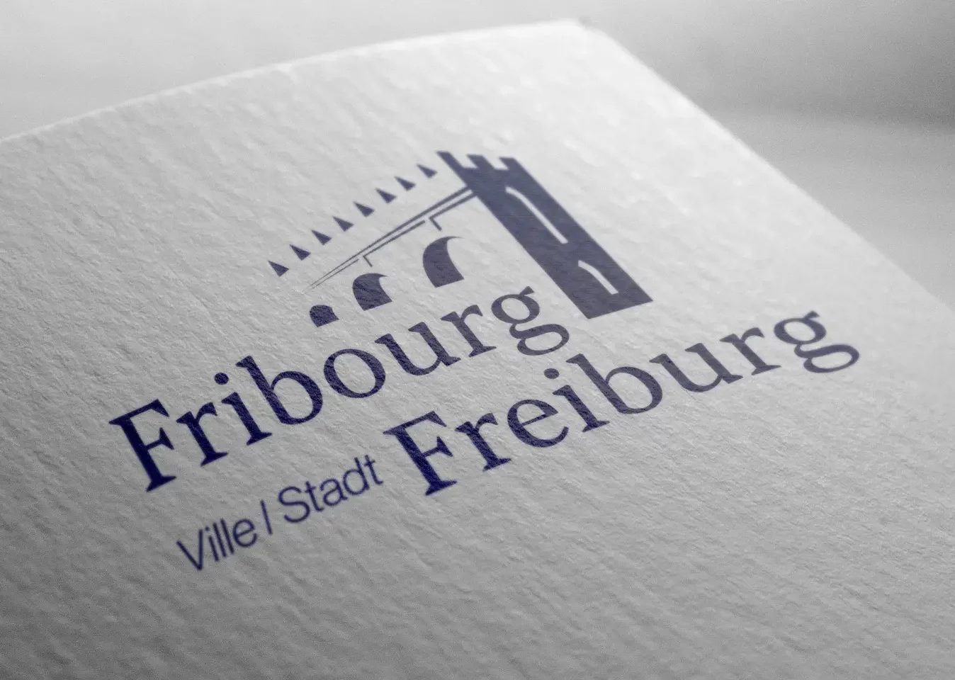 Le symbole, quant à lui, joue subtilement avec l’ombre et la lumière : la partie dans l’ombre ne comporte aucun dessin, tandis que la zone éclairée révèle les contours d’une version simplifiée de la cathédrale St-Nicolas, du pont de Zaehringen et de l’avant-mur crénelé de la ville. Ce jeu visuel renforce l’aspect historique du logotype, tout en respectant les codes de communication institutionnels des villes suisses.