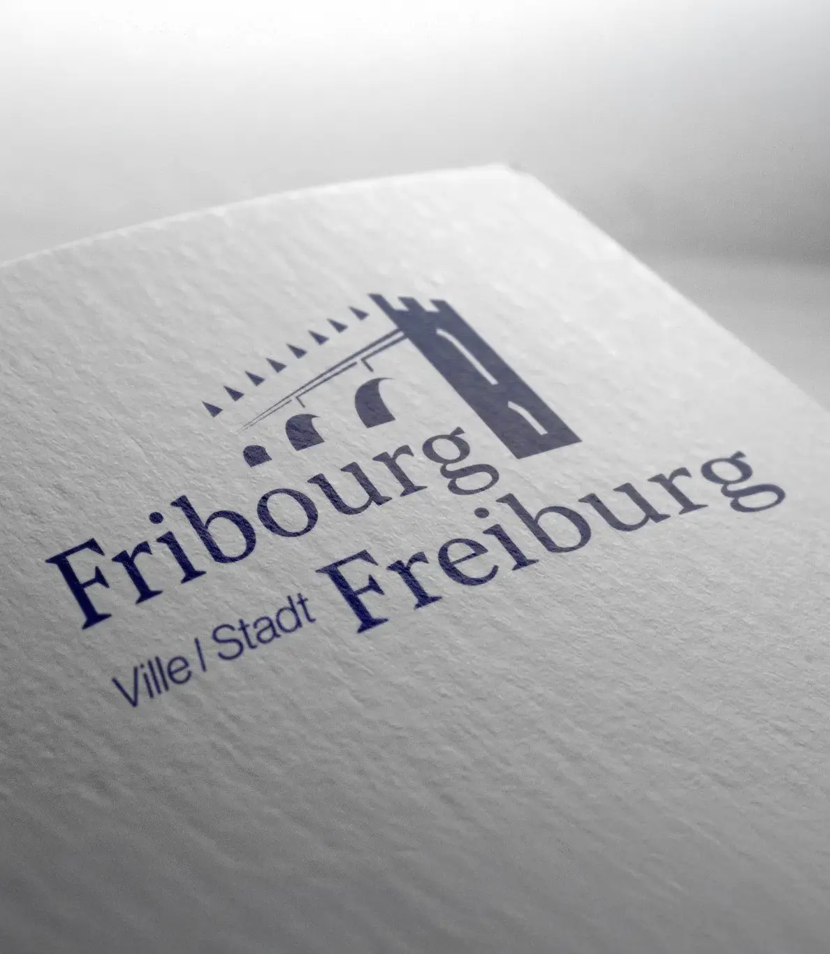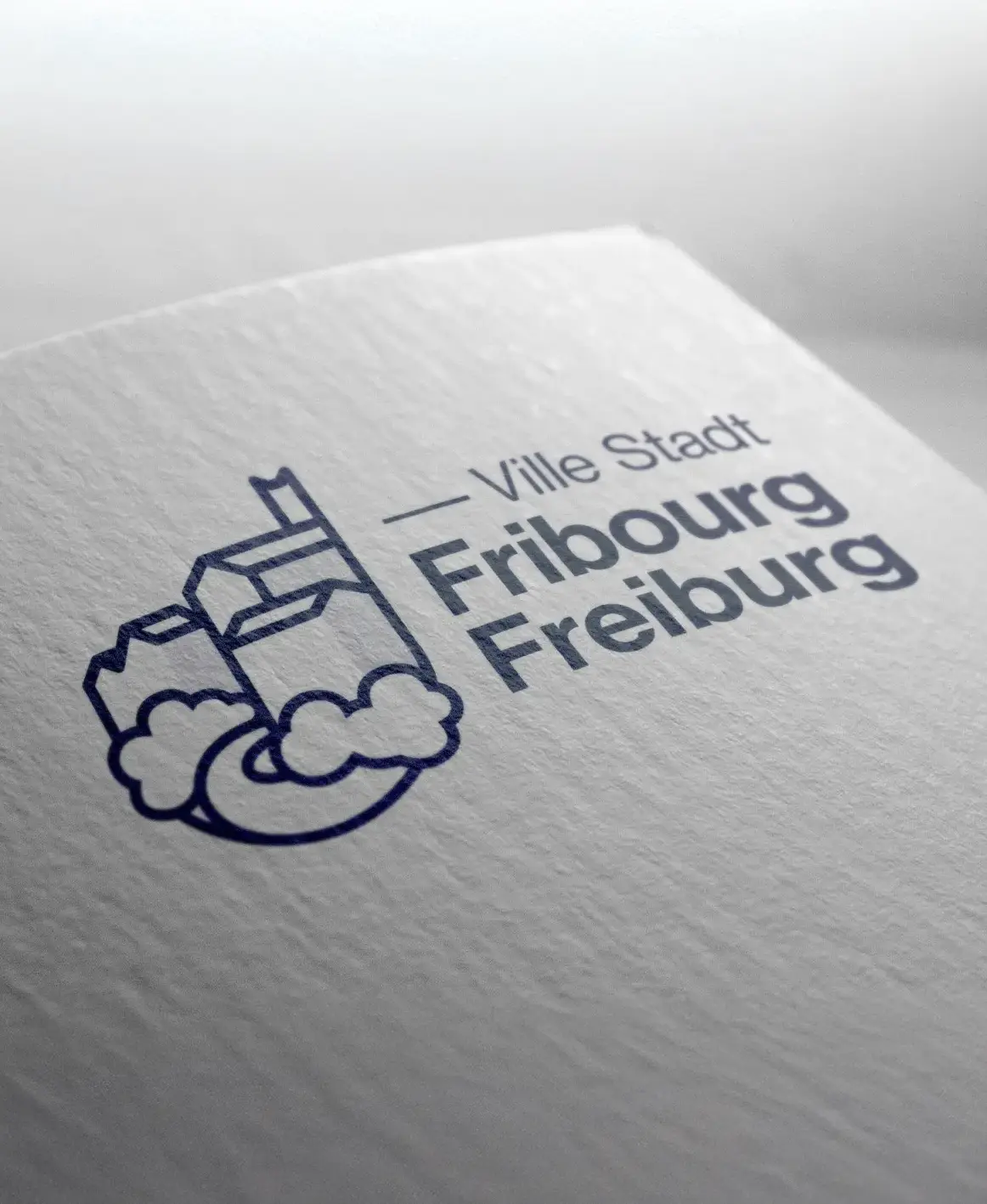 Le symbole, quant à lui, joue subtilement avec l’ombre et la lumière : la partie dans l’ombre ne comporte aucun dessin, tandis que la zone éclairée révèle les contours d’une version simplifiée de la cathédrale St-Nicolas, du pont de Zaehringen et de l’avant-mur crénelé de la ville. Ce jeu visuel renforce l’aspect historique du logotype, tout en respectant les codes de communication institutionnels des villes suisses.