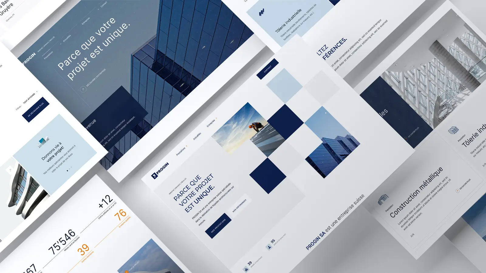 La société Progin SA sollicitait régulièrement l’agence où je travaillais pour divers projets graphiques. Récemment, elle avait décidé de refondre entièrement son site internet avec une approche plus professionnelle. J’ai alors eu l’opportunité de leur proposer deux concepts de design (présentés dans l’image ci-dessous). La version mettant en avant une grande image a été retenue et était en cours de finalisation.