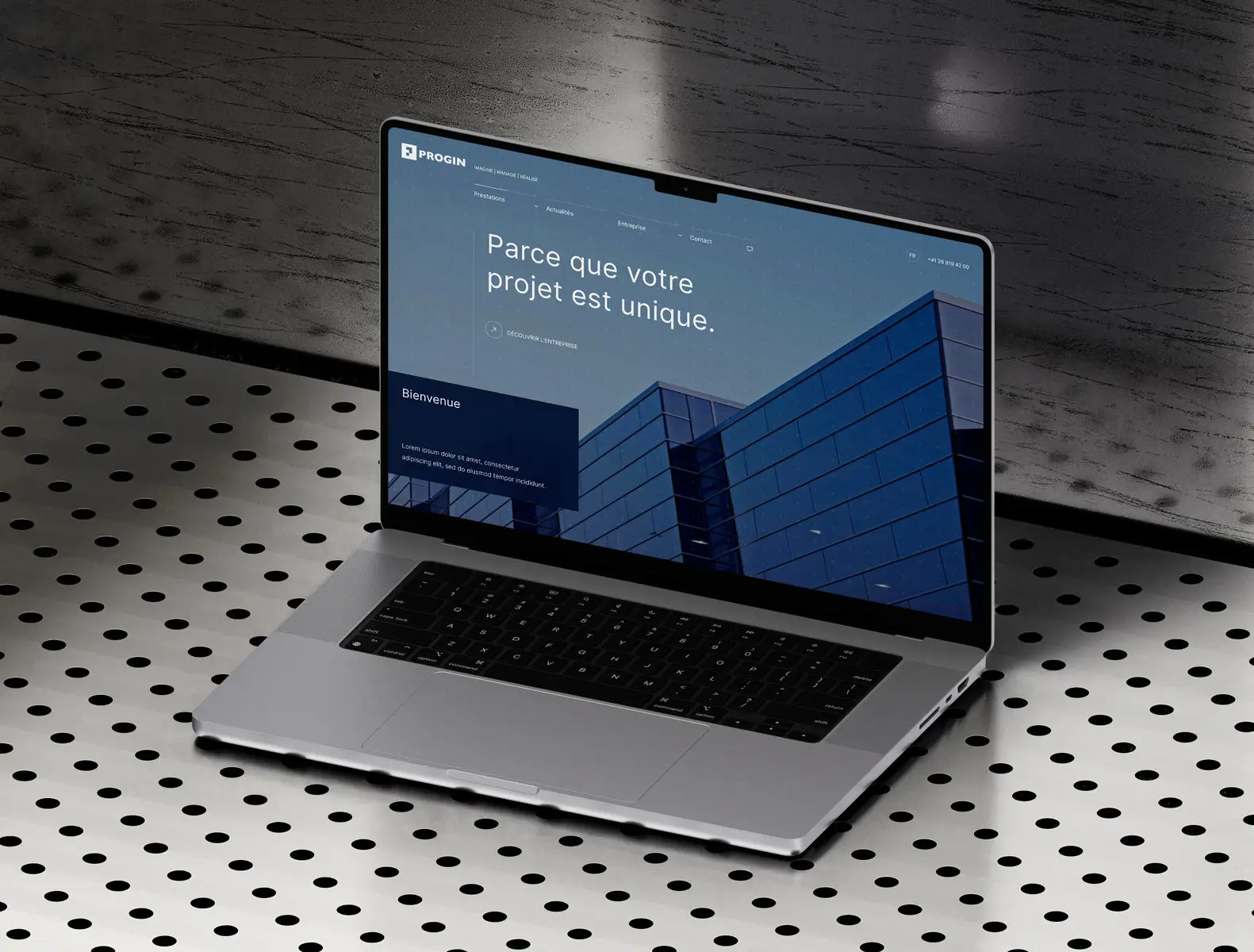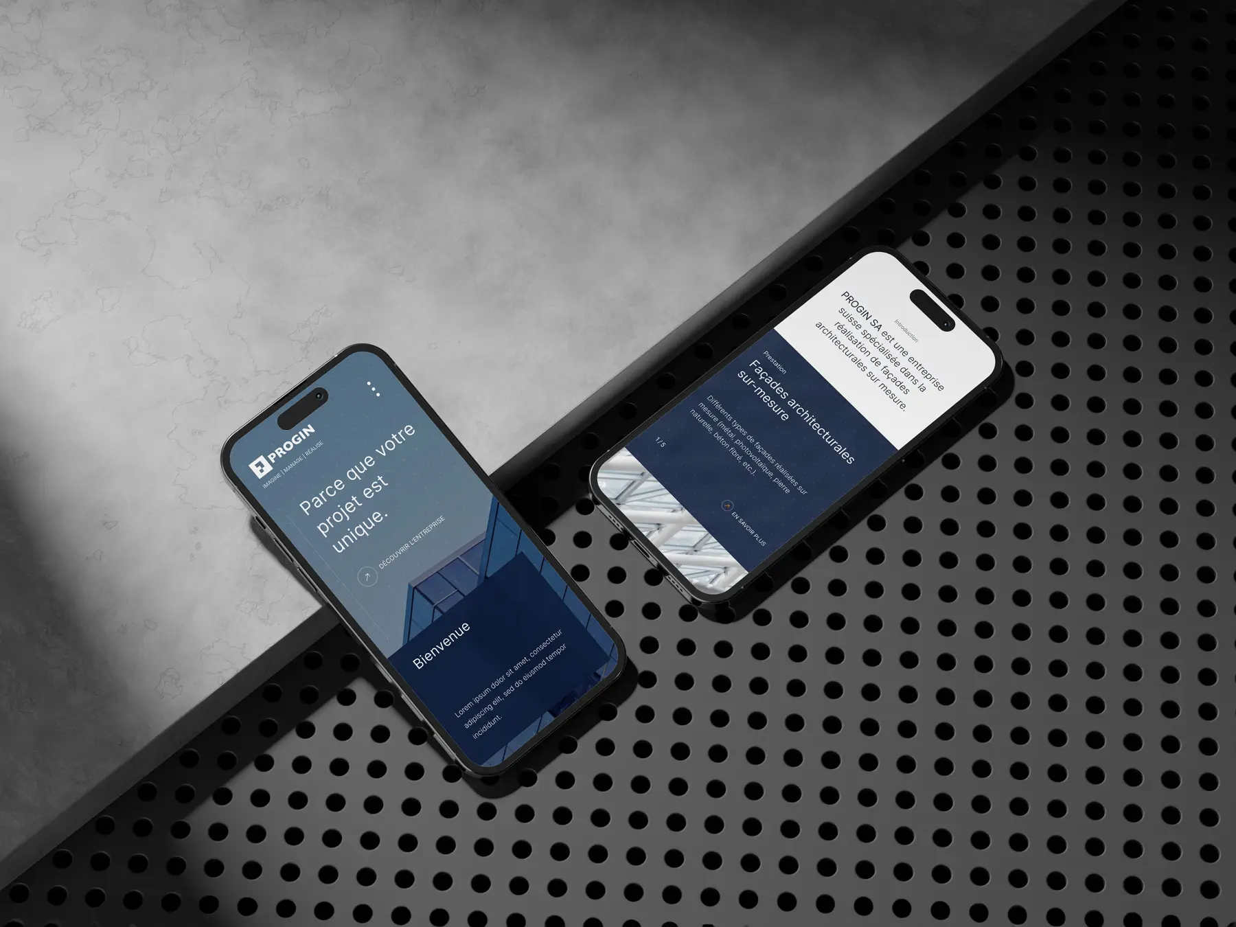 La société Progin SA sollicitait régulièrement l’agence où je travaillais pour divers projets graphiques. Récemment, elle avait décidé de refondre entièrement son site internet avec une approche plus professionnelle. J’ai alors eu l’opportunité de leur proposer deux concepts de design (présentés dans l’image ci-dessous). La version mettant en avant une grande image a été retenue et était en cours de finalisation.